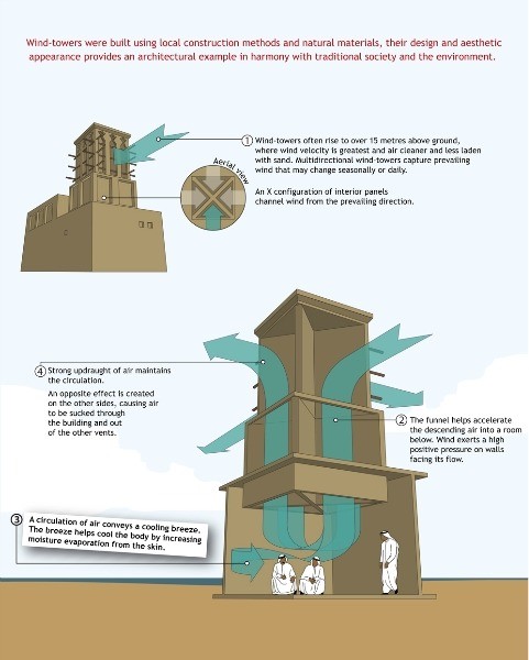 При этом, бадгиры — это не просто вытяжка. Благодаря размерам и расположению в самом сердце здания, они постоянно охлаждают его поверхности. Жар от стен передается врывающемуся ветру и также выходит наружу.